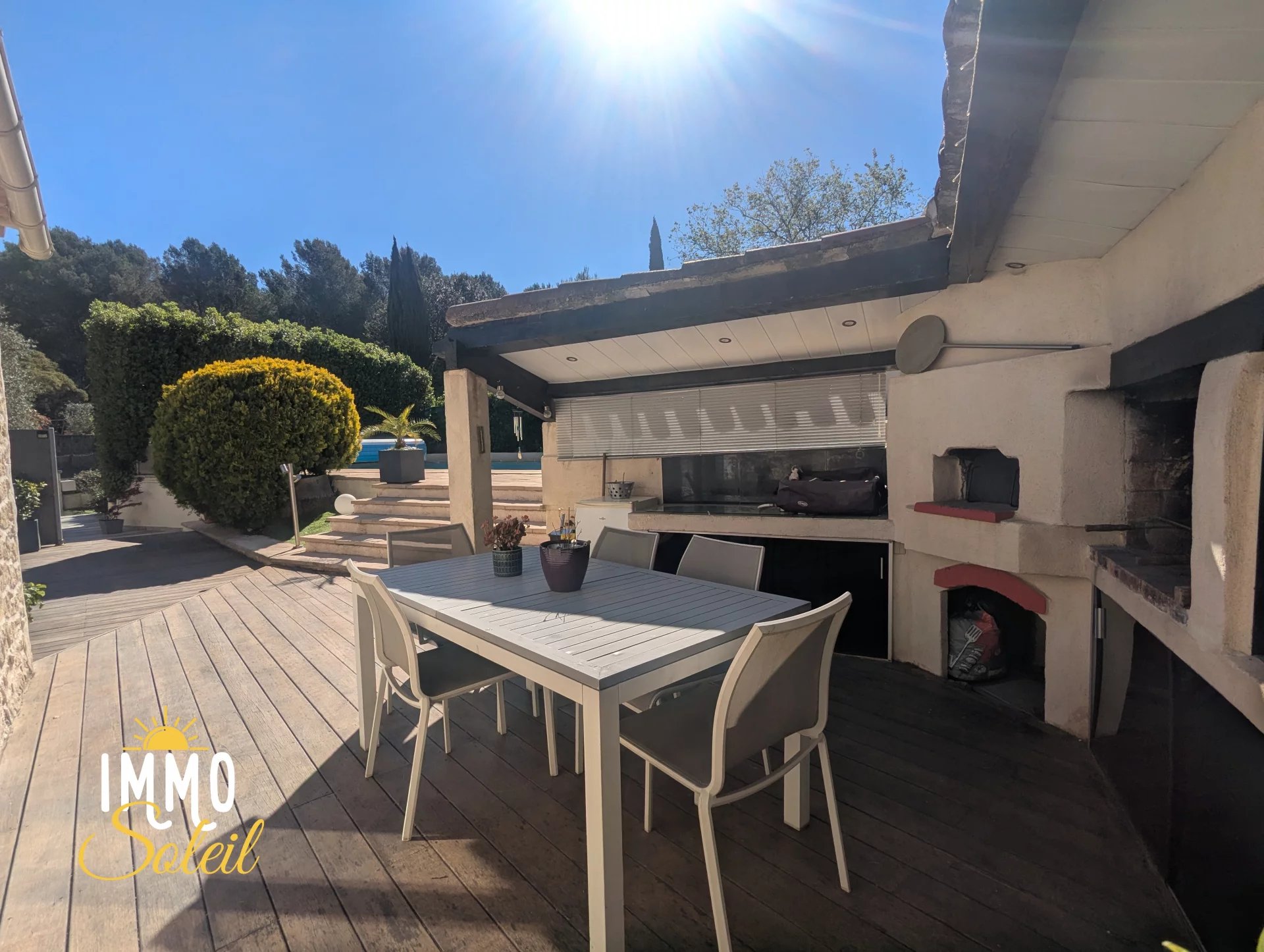 A l'extérieur vous profiterez de plusieurs espaces de vie terrassés côté Sud et Nord, une cuisine d'été avec plan évier, coin plancha, barbecue et four à pizza et une grande piscine 9 x 4,5 ml avec plage autour.