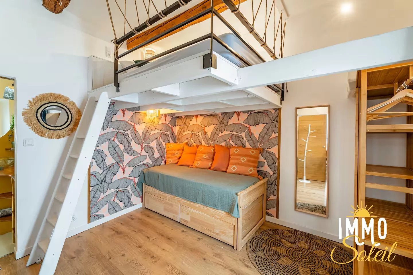 Charming 2-bedroom duplex apartment (approx. 60 m²) comprising on the ground floor a 25.50 m² living room with open-plan kitchen, a WC, and a storage room; upstairs, two bedrooms and a shower room with WC.